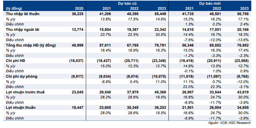 Sau khi Cổ phiếu VCB công bố KQKD 9 tháng đầu năm 2021 thấp hơn kỳ vọng, HSC giảm 8,9% dự báo lợi nhuận năm 2021 xuống còn 21.501 tỷ đồng (tăng trưởng 16,6%) sau khi hạ giả định tổng thu nhập hoạt động và nâng giả định chi phí dự phòng. Theo dự báo mới, lợi nhuận thuần Q4/2021 đạt 6.049 tỷ đồng, tăng 31,7% so với quý trước nhưng chỉ tăng 6,7% so với cùng kỳ.