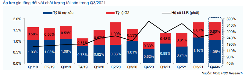 HSC thấy áp lực lên chất lượng tài sản của VCB tăng lên trong Q3/2021. Tổng nợ xấu tăng 59% (tăng 108% so với đầu năm) lên 10.884 tỷ đồng và VCB mới chỉ xóa 210 tỷ đồng nợ xấu (bằng 0,02% dư nợ cho vay) trong Q3/2021 trong khi nợ xấu mới hình thành là 4.229 tỷ đồng (bằng 0,45% dư nợ cho vay). Theo đó tỷ lệ nợ xấu giảm còn 1,16% (so với 0,74% tại thời điểm cuối Q2/2021 và 0,62% tại thời điểm cuối năm 2020). Hệ số LLR giảm còn 243% từ 352% tại thời điểm cuối Q2/2021 nhưng vẫn là mức cao nhất trong ngành ngân hàng.