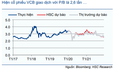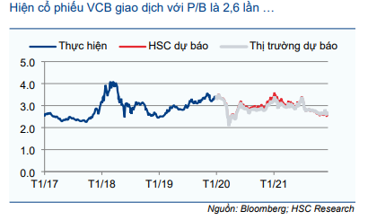 HSC duy trì khuyến nghị Tăng tỷ trọng đối với VCB nhưng giảm một chút giá mục tiêu dựa trên phương pháp thu nhập thặng dư xuống 113.800đ (tiềm năng tăng giá 13,9%). Tác động tích cực của việc lùi thời điểm định giá về cuối năm 2022 đã cân đối phần lớn tác động tiêu cực của việc hạ dự báo lợi nhuận năm 2021-2023. Mặc dù điều chỉnh giảm nhẹ, nhưng lợi nhuận dự báo tăng trưởng tốt trong năm 2022 (tăng trưởng 24,7%) và năm 2023 (tăng trưởng 30%). Hiện P/B dự phóng 1 năm là 2,6 lần; thấp hơn 0,8 độ lệch chuẩn so với bình quân P/B dự phóng 1 năm trong quá khứ (bình quân từ năm 2017) nhưng vẫn cao hơn đáng kể là 58% so với bình quân các NHTM khác mặc dù mức định giá phụ trội này đã thu hẹp trong thời gian qua.
