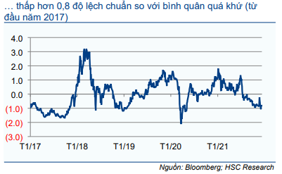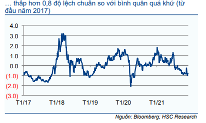 HSC giảm nhẹ giá mục tiêu xuống còn 113.800đ (tiềm năng tăng giá: 13,9%) do tác động tích cực của việc lùi thời điểm định giá về cuối năm 2022 đã cân đối phần lớn tác động tiêu cực của việc hạ dự báo lợi nhuận năm 2021-2023. Sau một năm giá cổ phiếu diễn biến kém khả quan, hiện cổ phiếu VCB có P/B dự phóng 1 năm thấp hơn 0,8 độ lệch chuẩn so với bình quân quá khứ với chênh lệch định giá với các NHTM khác đã thu hẹp so với mức bình thường (mặc dù vẫn khá cao). Nền tảng cơ bản của VCB vẫn rất vững chắc và triển vọng 2022-2023 tươi sáng hơn. Duy trì khuyến nghị Tăng tỷ trọng.