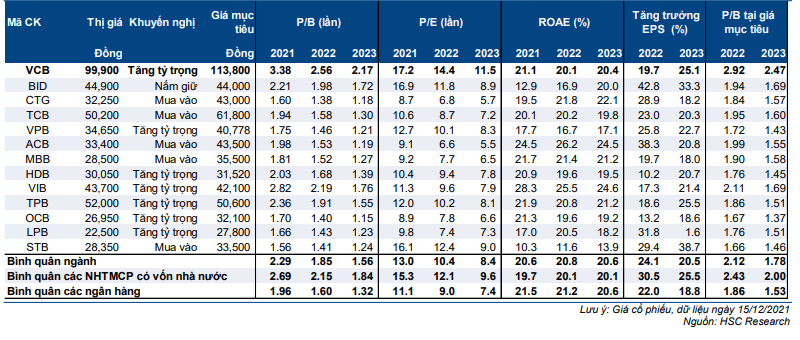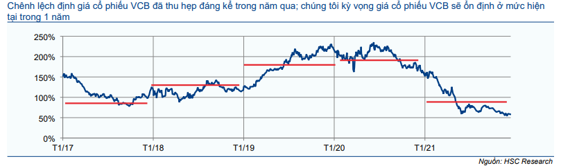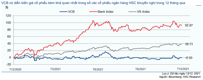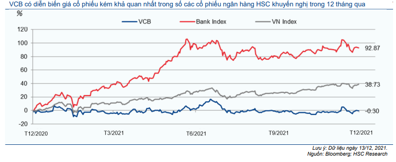 Cổ phiếu VCB có diễn biến giá cổ phiếu kém khả quan nhất trong số các cổ phiếu ngân hàng HSC khuyến nghị trong 12 tháng qua. Giá VCB đi ngang trong khi giá cổ phiếu ngân hàng tăng bình quân 93% (không tính VCB). Việc các NHTM có vốn nhà nước (như VCB) có trách nhiệm nhiều hơn trong giảm lãi suất cho vay, tái cơ cấu các khoản vay và “đi đầu” trong chủ động trích lập dự phòng trong đại dịch; bên cạnh việc định giá của VCB luôn ở mức cao so với các NHTM khác đã ảnh hưởng đến giá cổ phiếu. Mức định giá phụ trội của VCB so với các ngân hàng khác đã thu hẹp từ hơn 100% trong giai đoạn 2017-2020 xuống còn 58% vào ngày 15/12/2021. Hiện P/B dự phóng 1 năm của VCB thấp hơn 0,8 độ lệch chuẩn so với bình quân quá khứ là 2,6 lần (bình quân từ đầu năm 2017).
