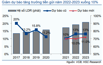 Theo đó, HSC giảm 1% dự báo tăng trưởng tín dụng năm 2021 (xuống 14%) và giữ nguyên dự báo cho năm 2022-0223 tại 15%. Chúng tôi cũng hạ 3% dự báo tăng trưởng huy động năm 2022 (còn 10%) và hạ 2% cho năm 2023 (còn 11%) vì cho rằng VCB sẽ tiếp tục nâng hệ số LDR để cải thiện hiệu quả sử dụng vốn.