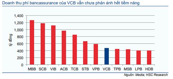 Trong khi đó, thu nhập từ bancassurance sát kỳ vọng của HSC. Hoa hồng bancassurance 9 tháng đầu năm 2021 đạt 475 tỷ đồng (kế hoạch cả năm 2021 của VCB là 500 tỷ đồng và dự báo của HSC là 620 tỷ đồng). So với nhiều NHTM tư nhân, mức thu nhập từ bancassurance của VCB không mấy ấn tượng. Nhưng chúng tôi tin rằng VCB có khả năng đẩy mạnh mảng bancassurance hơn nhiều nhờ có mạng lưới rộng và cơ sở khách hàng lớn (16 triệu khách hàng). Theo đó, HSC kỳ vọng hoa hồng bancassurance sẽ tăng 69% trong năm 2022 và tăng 56% trong năm 2023.