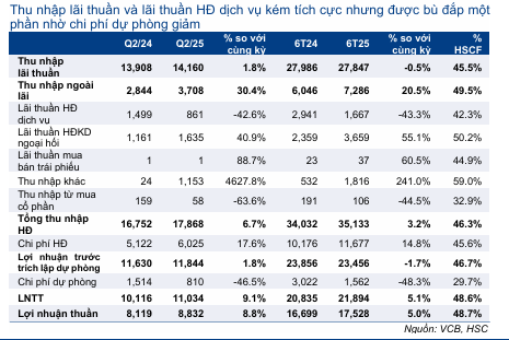 VCB công bố LNTT Q2/2025 đạt 11.000 tỷ đồng, tăng 9,1% so với cùng kỳ, và LNTT 6 tháng đầu năm 2025 tăng 5,1% so với cùng kỳ, sát với dự báo của chúng tôi. Nhìn chung, kết quả này cho thấy sự ổn định và vững chắc. Ngân hàng tiếp tục duy trì tỷ lệ NIM ở mức thấp để hỗ trợ nền kinh tế. Thu nhập phí & tỷ lệ NIM thấp đã được bù đắp bởi lãi thuần HĐ kinh doanh ngoại hối & thu nhập từ thu hồi nợ ngoại bảng tăng trưởng tốt và chi phí dự phòng thấp hơn dự báo.