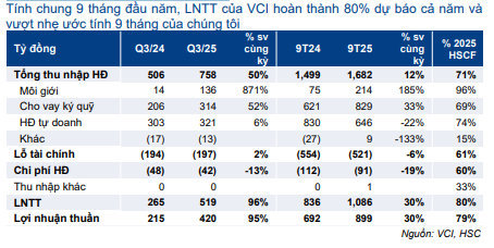 Lãi hoạt động tự doanh 9 tháng đầu năm 2025 đạt 646 tỷ đồng, giảm 22% so với cùng kỳ nhưng hoàn thành 74% dự báo cả năm và sát với dự báo 9 tháng của chúng tôi. Trong Q4/2025, dựa trên triển vọng thanh khoản vững chắc có thể hỗ trợ hoạt động tự doanh cho VCI, chúng tôi kỳ vọng VCI sẽ hoàn thành dự báo cả năm hiện tại.