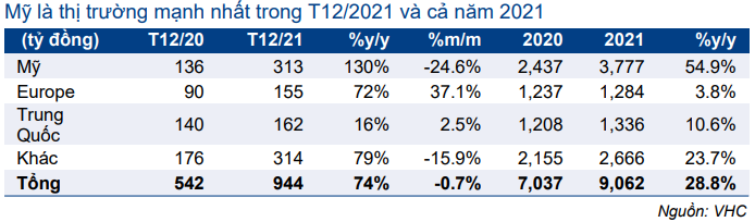 Doanh thu tại Mỹ tăng mạnh nhất 130% so với cùng kỳ đạt 313 tỷ đồng trong tháng 12/2021 (mặc dù vẫn giảm 25% so với tháng trước). Doanh thu tại châu Âu vẫn tăng khả quan 72% so với cùng kỳ đạt 155 tỷ đồng. Doanh thu tại Trung Quốc tăng 16% so với cùng kỳ đạt 162 tỷ đồng.