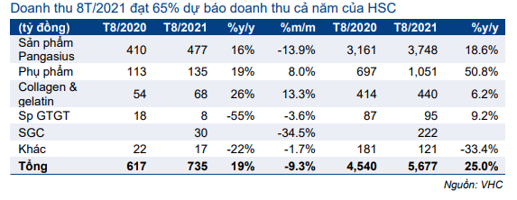 - Doanh thu phụ phẩm tăng 19% so với cùng kỳ và tăng 8% so với tháng trước, đạt 135 tỷ đồng. Trong 8 tháng đầu năm 2021, doanh thu tăng 50,8% so với cùng kỳ lên 1.015 tỷ đồng.