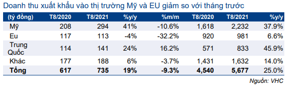 Doanh thu xuất khẩu sang thị trường Mỹ tăng 41% so với cùng kỳ nhưng giảm 11% so với tháng trước còn 294 tỷ đồng. Doanh thu xuất khẩu sang thị trường Trung Quốc tăng 24% so với cùng kỳ và tăng 16% so với tháng trước đạt 121 tỷ đồng. Doanh thu xuất khẩu sang thị trường châu Âu giảm 4% so với cùng kỳ và giảm 32% so với tháng trước còn 113 tỷ đồng. Nếu không tính 19,6 tỷ đồng đóng góp từ SGC (công ty sản xuất phồng tôm mà VHC mua lại trong Q1/2021), doanh thu từ châu Âu giảm 21% so với cùng kỳ và 27% so với tháng trước.