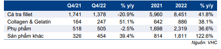 Doanh thu các sản phẩm tăng giảm không đồng đều trong Q4/2022. Doanh thu cá tra (sản phẩm chính của VHC) giảm đáng kể, giảm 20,9% so với cùng kỳ xuống còn 1.378 tỷ đồng. Điều này chủ yếu là vì doanh thu xuất khẩu sang thị trường Mỹ và Trung Quốc lần lượt giảm 25,9% và 61,1% so với cùng kỳ. Theo ước tính của HSC, sản lượng xuất khẩu đã giảm 17,2% so với cùng kỳ và giá bán bình quân giảm 4,4% so với cùng kỳ.