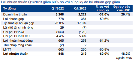 VHC đã công bố KQKD Q1/2023 với lợi nhuận thuần đạt 219 tỷ đồng (giảm 60% so với cùng kỳ) và doanh thu thuần đạt 2.222 tỷ đồng (giảm 32% so với cùng kỳ). Lợi nhuận thuần Q1/2023 kém vì yếu tố mùa vụ nhưng vẫn cao hơn 10% so với ước tính của HSC nhờ tỷ suất lợi nhuận gộp vượt kỳ vọng. Lợi nhuận thuần thực hiện Q1/2023 bằng 18,2% dự báo của chúng tôi cho cả năm 2023 trong khi doanh thu thuần bằng 20,4% dự báo cho cả năm. Các khoản mục không thường xuyên trong kỳ có giá trị không lớn.