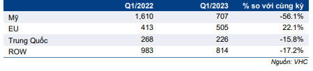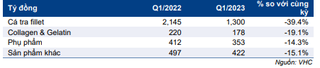 Doanh thu Q1/2023 giảm ở tất cả các sản phẩm. Doanh thu cá tra fillet – sản phẩm quan trọng nhất của VHC – giảm 39,4% so với cùng kỳ xuống còn 1.300 tỷ đồng vì lượng xuất khẩu giảm 30,1% và giá xuất khẩu giảm 18,6%. Doanh thu phụ phẩm giảm 14,3% so với cùng kỳ còn 353 tỷ đồng trong khi doanh thu collagen và gelatin giảm 19% so với cùng kỳ còn 178 tỷ đồng.