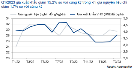 Giá xuất khẩu bình quân cũng đã tăng lên 3,7 USD/tấn trong tháng 3/2023 (so với 3,2 USD/tấn trong tháng 1 và tháng 2), nhưng mức giá này vẫn thấp hơn 14% so với cùng kỳ năm ngoái.