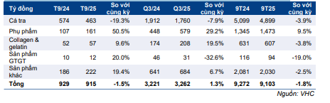 Doanh thu Collagen & Gelatin đạt 57 tỷ đồng, tăng 9,6% so với cùng kỳ nhưng giảm 31,3% so với tháng trước. Theo đó, doanh thu của phân khúc sản phẩm này trong Q3/2025 đạt 208 tỷ đồng, tăng 19,5% so với cùng kỳ.