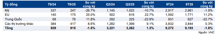 Doanh thu xuất khẩu sang Mỹ giảm mạnh 26,7% so với cùng kỳ xuống 247 tỷ đồng (giảm 8,9% so với tháng trước). Theo đó, doanh thu xuất khẩu sang thị trường này trong Q3/2025 đạt 1.022 tỷ đồng, giảm 10,7% so với cùng kỳ.