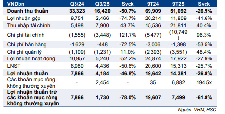 VHM công bố BCTC Q3/2025, cho thấy lợi nhuận thuần và doanh thu đạt lần lượt 4,2 nghìn tỷ đồng (giảm 47% so với cùng kỳ) và 16,4 nghìn tỷ đồng (giảm 51% so với cùng kỳ). Doanh thu và lợi nhuận thuần giảm là do ảnh hưởng của yếu tố thời điểm – số lượng căn hộ bàn giao thấp trong Q3/2025 nhưng được kỳ vọng sẽ tăng mạnh trong Q4/2025. Hoạt động bán buôn tại dự án Vinhomes Golden City (Hải Phòng) đóng góp 59% vào lợi nhuận thuần.