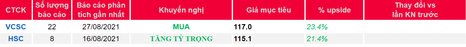 - Chúng tôi gần như giữ nguyên giá mục tiêu cho CTCP Tập đoàn Vingroup (Cổ phiếu VIC) là 117.000 đồng/CP (so với giá mục tiêu trước đó là 118.000 đồng/CP sau khi điều chỉnh chia cổ tức bằng cổ phiếu 12,5%) đồng thời nâng khuyến nghị lên MUA từ KHẢ QUAN do giá cổ phiếu VIC đã đã điều chỉnh 11% trong 3 tháng qua.