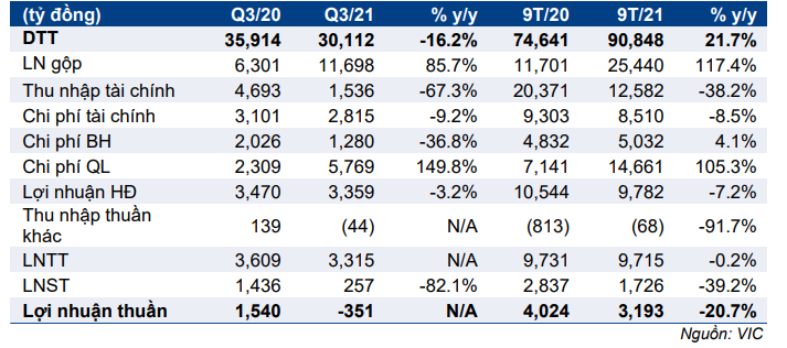 Lợi nhuận thuần 9 tháng đầu năm 2021 là 3,2 nghìn tỷ đồng (giảm 20,7% so với cùng kỳ) với doanh thu thuần là 91 nghìn tỷ đồng (tăng 21,7% so với cùng kỳ). Lợi nhuận 9 tháng đầu năm 2021 đã vượt dự báo cả năm 2021 của chúng tôi là 970 tỷ đồng do chúng tôi dự báo VIC sẽ tiếp tục lỗ thuần trong Q4/2021.