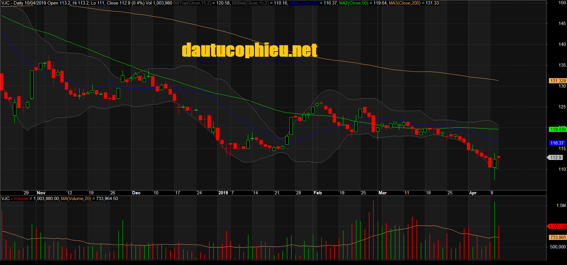 Đồ thị cổ phiếu VJC phiên giao dịch ngày 10/04/2019. Nguồn: AmiBroker