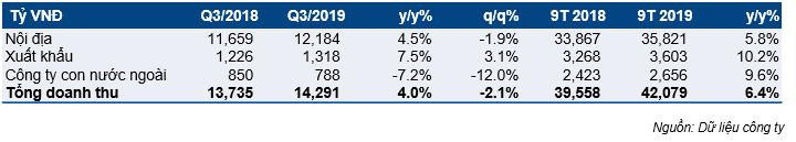 Lũy kế 9 tháng, doanh thu thuần đạt 38.134 tỷ đồng (tăng 12,4% so với cùng kỳ), LNTT đạt 4.206 tỷ đồng (tăng 8,7% so với cùng kỳ) và LNST đạt 3.681 tỷ đồng (giữ nguyên so với cùng kỳ). Theo đó, VJC đã hoành thành được 65,3% kế hoạch doanh thu và 66,9% kế hoạch lợi nhuận đề ra cho cả năm. LNTT thực hiện cũng bằng 68,2% dự báo của HSC cho cả năm 2019.