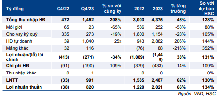 LNTT Q4/2023 đạt 991 tỷ đồng (so với lỗ 33 tỷ đồng trong Q4/2022 và tăng 26% so với quý trước), chủ yếu nhờ lãi hoạt động tự doanh (đạt 1.040 tỷ đồng, tăng 25 lần so với cùng kỳ) trong khi lợi nhuận nghiệp vụ môi giới và lãi từ cho vay ký quỹ lần lượt giảm 65% và 19% so với cùng kỳ.