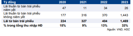 Lãi từ danh mục trái phiếu của VND đã tăng lên đáng kể theo thời gian, chiếm 33% tổng doanh thu hoạt động năm 2023. HSC tin rằng VND nên đầu tư nhiều hơn vào HĐKD cốt lõi (nghiệp vụ môi giới, cho vay ký quỹ) thay vì mảng này.