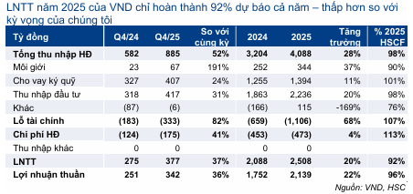 Nhìn chung, KQKD Q4/2025 và cả năm 2025 của Cổ phiếu VND không đạt kỳ vọng. Chúng tôi sẽ đánh giá lại triển vọng lợi nhuận của VND do thu nhập đầu tư sụt giảm (không bao gồm các khoản mục không thường xuyên) và chi phí tài chính tăng cao, trong khi các khoản đầu tư trái phiếu tồn đọng vẫn chưa cải thiện rõ rệt. Sau khi giá cổ phiếu giảm 4% trong 1 tháng qua, VND đang giao dịch với P/E trượt dự phóng 1 năm là 16,6 lần (cao hơn khoảng 0,2 độ lệch chuẩn so với bình quân 5 năm), vẫn thấp hơn bình quân của các công ty cùng ngành ở mức 17,5 lần. HSC đang xem xét lại khuyến nghị, giá mục tiêu và dự báo.