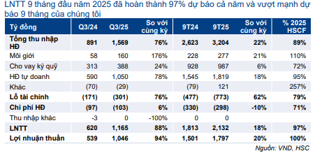 Lợi nhuận nghiệp vụ môi giới 9 tháng đầu năm 2025 đạt 277 tỷ đồng (tăng 21% so với cùng kỳ), hoàn thành 110% dự báo cả năm và vượt đáng kể dự báo 9 tháng của chúng tôi.