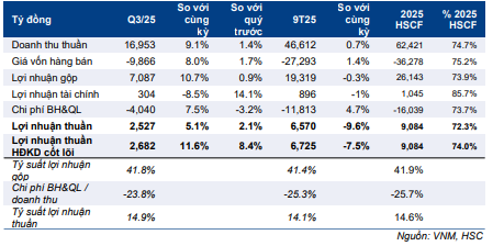 Tính chung 9 tháng đầu năm 2025, doanh thu thuần gần như đi ngang so với cùng kỳ ở mức 46.612 tỷ đồng, đạt 74,7% dự báo cho cả năm 2025 của HSC, trong khi lợi nhuận thuần giảm 9,6% so với cùng kỳ xuống 6.570 tỷ đồng (do khoản trích lập dự phòng bất ngờ) và lợi nhuận thuần HĐKD cốt lõi đạt 6.725 tỷ đồng, bằng 74% dự báo cho cả năm 2025 của HSC.