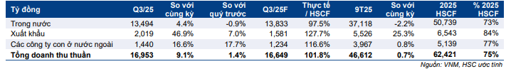 KQKD Q3/2025 của VNM nhìn chung đúng với kỳ vọng của HSC. Lợi nhuận thuần tăng nhẹ 5,1% so với cùng kỳ đạt 2.527 tỷ đồng, trên doanh thu thuần 16.963 tỷ đồng (tăng 9,1% so với cùng kỳ). Lợi nhuận thuần của VNM sát với ước tính của HSC ở mức 2.563 tỷ đồng, trong khi doanh thu thuần chỉ vượt dự báo của chúng tôi 1,8%. So với quý trước, doanh thu thuần và lợi nhuận thuần tăng khiêm tốn 1,4% và 1,2%.