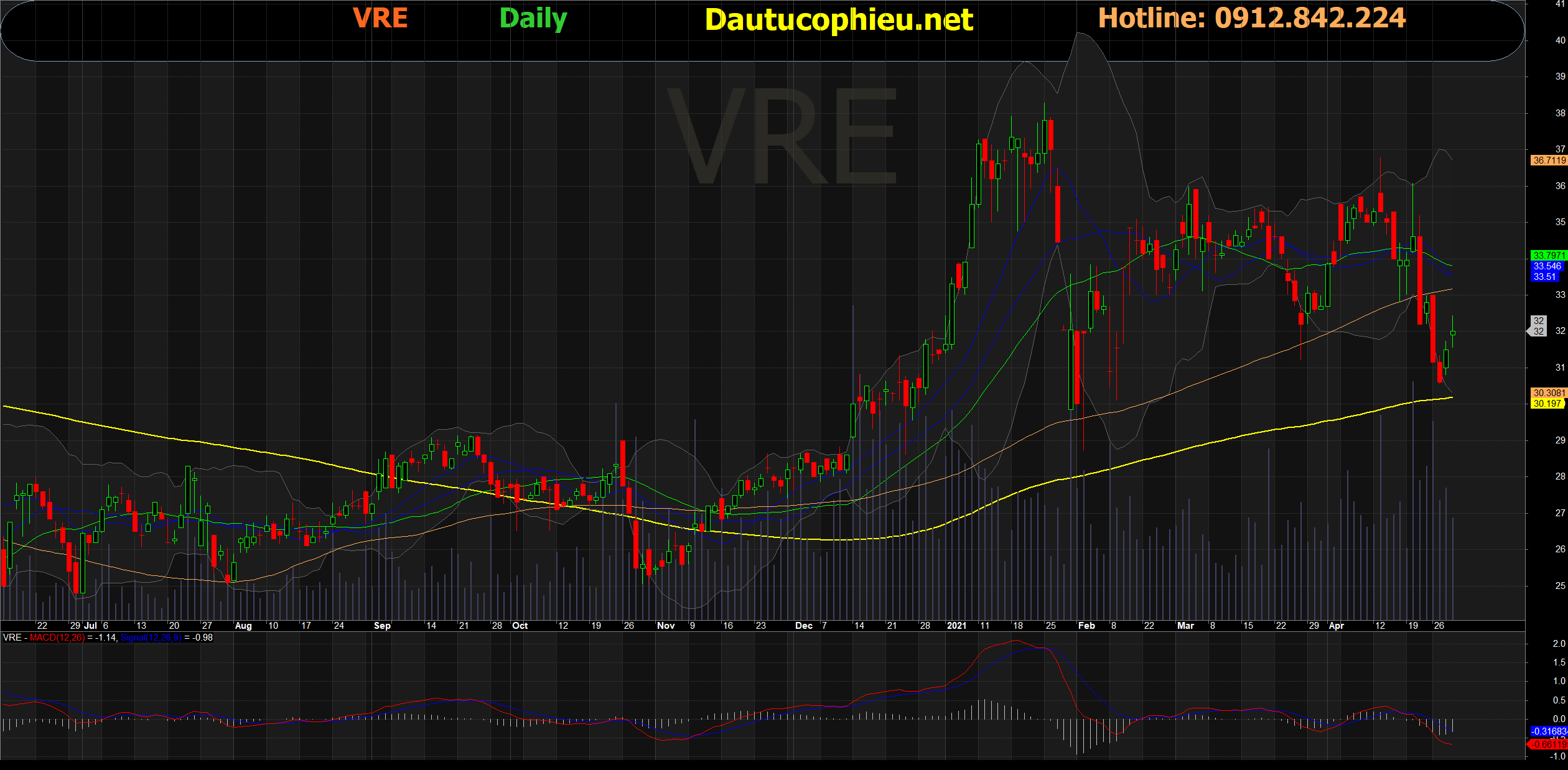 Đồ thị cổ phiếu VRE phiên giao dịch ngày 29/04/2021. Nguồn: AmiBroker
