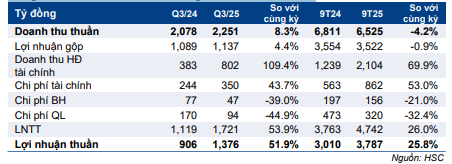 Lợi nhuận thuần và doanh thu thuần 9 tháng đầu năm 2025 đạt lần lượt 3.787 tỷ đồng và 6.525 tỷ đồng, hoàn thành 91% và 69,3% dự báo cho cả năm của chúng tôi (và đạt 80,6% và 68,5% KHKD công ty đề ra). Dự báo lợi nhuận cho năm 2025 của chúng tôi có vẻ thấp hơn thực tế.
