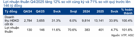 KQKD sơ bộ Q4/2025 của VTP tích cực và sát với dự báo, với doanh thu HĐKD cốt lõi (chuyển phát và logistics) đạt 3,7 nghìn tỷ đồng (tăng 31% so với cùng kỳ và 6% so với quý trước) và lợi nhuận thuần đạt 146 tỷ đồng (tăng 12% so với cùng kỳ và 71% so với quý trước).