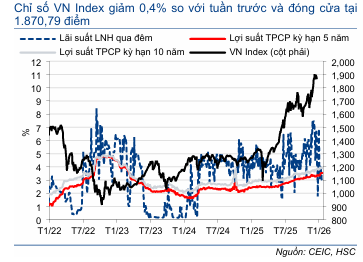 HSC cập nhật xu hướng thị trường chứng khoán và biến động tỷ giá trong Biểu đồ 3 và 4. Tuần trước, chỉ số VNIndex giảm 0,4% xuống 1.870,79 điểm, kết thúc 5 tuần tăng điểm liên tiếp, trong khi tỷ giá USD/VND (niêm yết tại VCB) giảm 0,061% xuống 26.206.