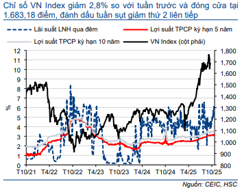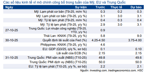 Tuần này, những thông tin chính bao gồm: Các quyết định chính sách tiền tệ quan trọng với cuộc họp FOMC diễn ra mà các dữ liệu thường lệ chưa được công bố trong bối cảnh chính phủ Mỹ tiếp tục đóng cửa, hiện là đợt đóng cửa dài thứ hai trong lịch sử Mỹ và chưa có dấu hiệu cho thấy tình hình sẽ được giải quyết. Thị trường dự báo Fed sẽ tiếp tục cắt giảm 0,25 điểm cơ bản lãi suất điều hành, tương đương lãi suất Fed giảm xuống 3,75-4%. Mùa báo cáo lợi nhuận của Mỹ cũng nóng lên khi các gã khổng lồ công nghệ lớn, Microsoft, Apple, Amazon, Meta và Alphabet, sẽ công bố KQKD Q3.