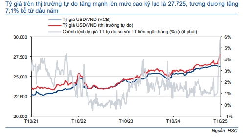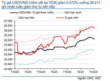 HSC cập nhật xu hướng thị trường chứng khoán và biến động tỷ giá trong Biểu đồ 2 và 3. Tuần trước, chỉ số VNIndex giảm 2,8% xuống 1.683,18 điểm, trong khi tỷ giá USD/VND giảm 0,07% xuống 26.217, tuần giảm thứ 4 liên tiếp. Lưu ý, tỷ giá trên thị trường tự do tăng lên mức cao kỷ lục 27,725, tương đương tăng 7,1% kể từ đầu năm, điều này cho thấy nhu cầu gia tăng đối với đồng USD trong giai đoạn cuối năm.