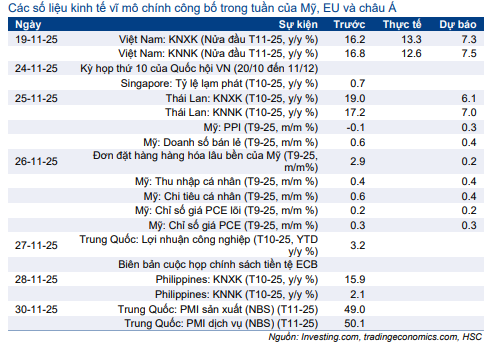Tại Mỹ, số ngày giao dịch tuần này sẽ rút ngắn do kỳ nghỉ lễ Tạ ơn, trong đó thị trường sẽ đóng cửa vào thứ năm và hoạt động nửa ngày vào thứ sáu. Khi các cơ quan chính phủ xử lý bổ sung số liệu tồn đọng do chậm công bố sau khi mở cửa trở lại vào ngày 12/11/2025, lịch trình cập nhật cho các số liệu quan trọng dự kiến sẽ được công bố. Thị trường sẽ tập trung vào chỉ số PPI tháng 9, dự báo tăng 0,3% so với tháng trước sau khi giảm 0,1% so với tháng trước trong tháng 8, tương đương tăng 2,7% so với cùng kỳ. Doanh số bán lẻ được dự báo tăng chậm lại ở mức 0,4% so với tháng trước, trong khi số lượng đơn đặt hàng hàng hóa lâu bền nhiều khả năng sẽ chỉ tăng 0,2% so với tháng trước sau khi tăng mạnh 2,9% so với tháng trước trong tháng 8. Tại khu vực Eurozone, thị trường sẽ theo dõi biên bản cuộc họp chính sách tiền tệ của ECB sau khi lãi suất điều hành được giữ nguyên trong kỳ họp thứ 3 liên tiếp vào tháng 10.