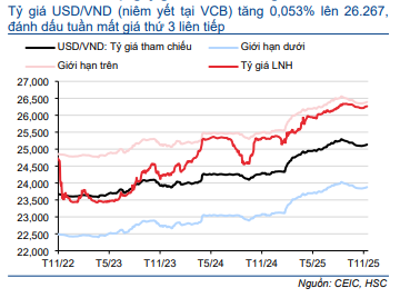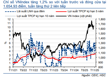 HSC cập nhật xu hướng thị trường chứng khoán và biến động tỷ giá trong Biểu đồ 2 và 3. Tuần trước, chỉ số VNIndex tăng 1,2% lên 1.654,93 điểm, tuần tăng thứ 2 liên tiếp trong khi tỷ giá USD/VND tăng 0,053% lên 26.267, tuần mất giá thứ 3 liên tiếp. Tỷ giá trên thị trường tự do ở mức 27,850, tương đương mất giá 7,5% kể từ đầu năm và chênh lệch 6% so với tỷ giá liên ngân hàng, điều này cho thấy nhu cầu gia tăng đối với đồng USD trong giai đoạn cuối năm.