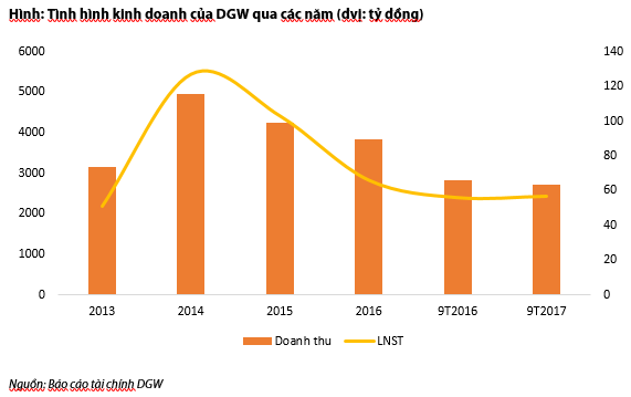 Có thể thấy doanh thu và lợi nhuận của DGW liên tục sụt giảm từ năm 2015 khi công ty phải “chia tay” với mảng phân phối điện thoại Nokia (do Microsoft bỏ kinh doanh phần cứng), qua năm 2016 đà giảm doanh thu chậm lại nhưng chi phí bán hàng và quản lý tăng cao do công ty mở rộng hoạt động kinh doanh. Đến năm 2017 tình hình kinh doanh bắt đầu phục hồi nhờ việc ký kết hợp dồng phân phối độc quyền với Xiaomi, lợi nhuận sau thuế 9 tháng đầu năm nay đã gần bằng với cả năm 2016.