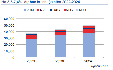 Chúng tôi hạ lần lượt 6,3% và 3,3% dự báo lợi nhuận thuần của 5 cổ phiếu BĐS chúng tôi khuyến nghị trong năm 2022 và 2023. Nỗ lực tăng cường giám sát tín dụng vào ngành BĐS của Chính phủ có thể làm chậm thủ tục giấy tờ và giảm lợi nhuận được hạch toán trong năm 2022-2023. Trong khi đó, HSC giảm 7,4% dự báo lợi nhuận thuần trong năm 2024, chủ yếu do chúng tôi hạ dự báo doanh số bán nhà trong năm 2022-2023.
